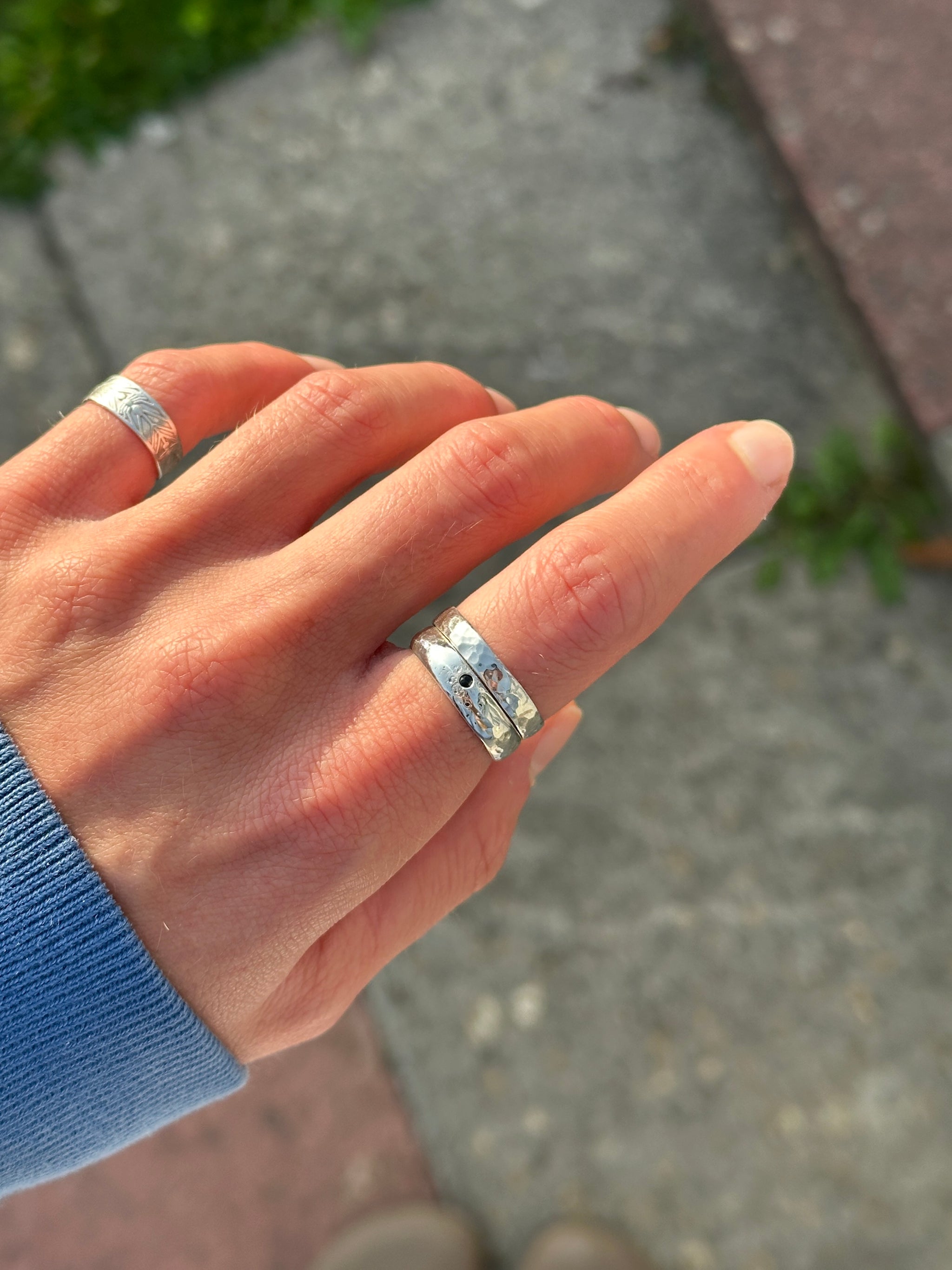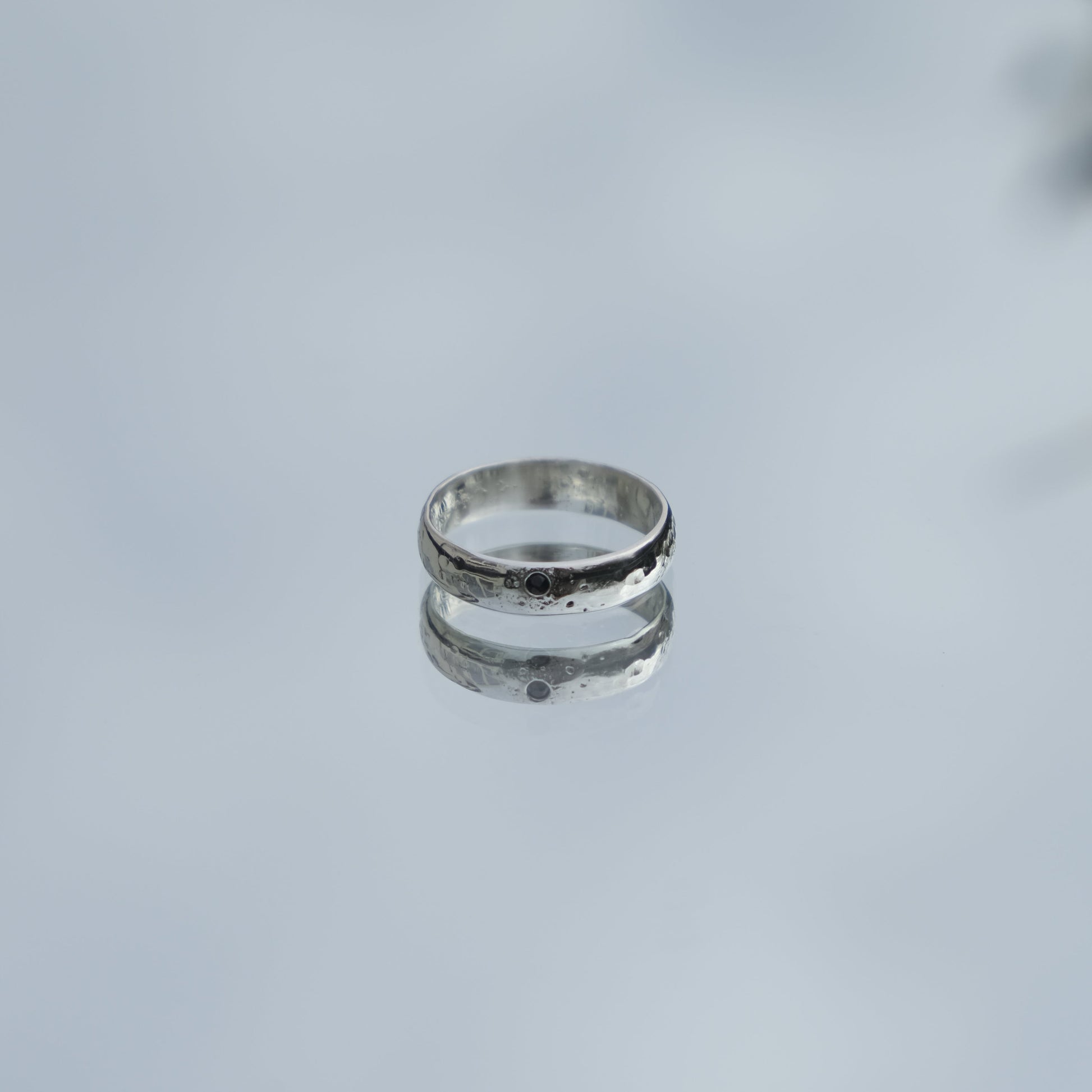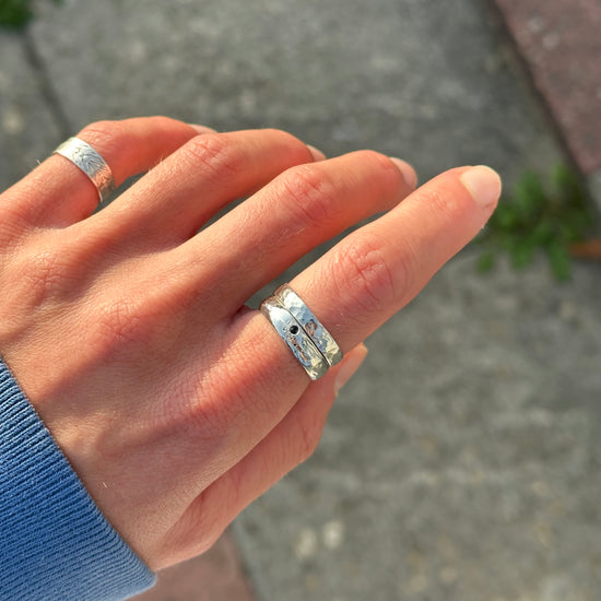 Handcrafted from 100% recycled 925 sterling silver, the Miri Ring features a dark blue sapphire set on a half-hammered band that adds the perfect subtle texture. Designed for effortless stacking.